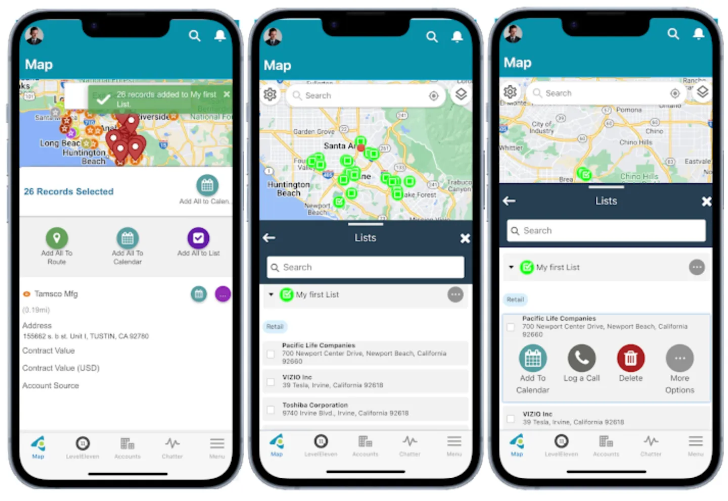 Geopointe users can create targeted lists of Salesforce objects – like Accounts, Opportunities, Leads, etc — directly from the map. The mobile experience also allows users to work off of previously created Geopointe Lists in order to organize routes or collaborate with team members inside of Geopointe on the go.