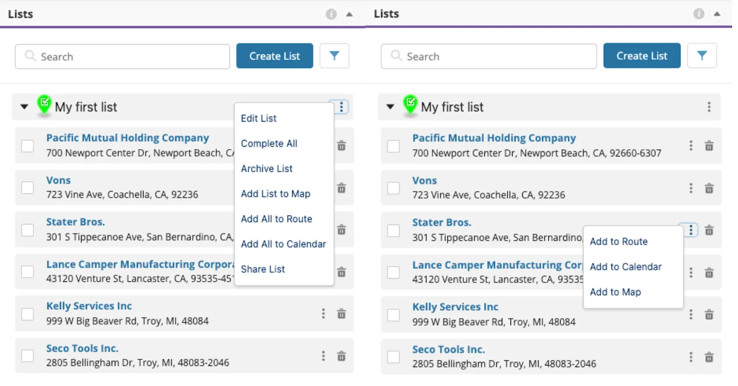 - “Add to Calendar” and “Add to Route” Actions to bring list items into planned visits