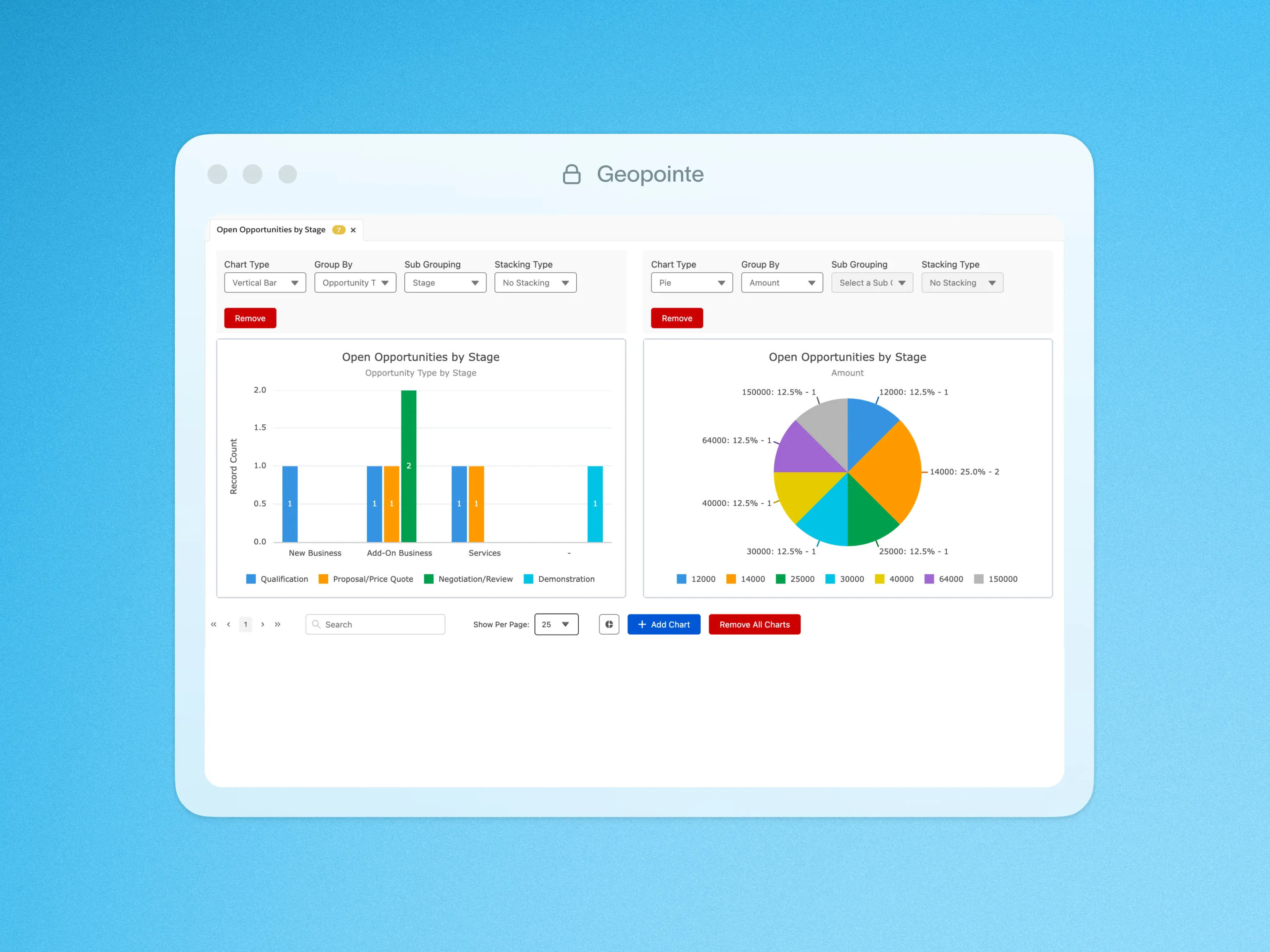 Use interactive charts to analyze mapped data and spot trends without leaving the Geopointe interface.