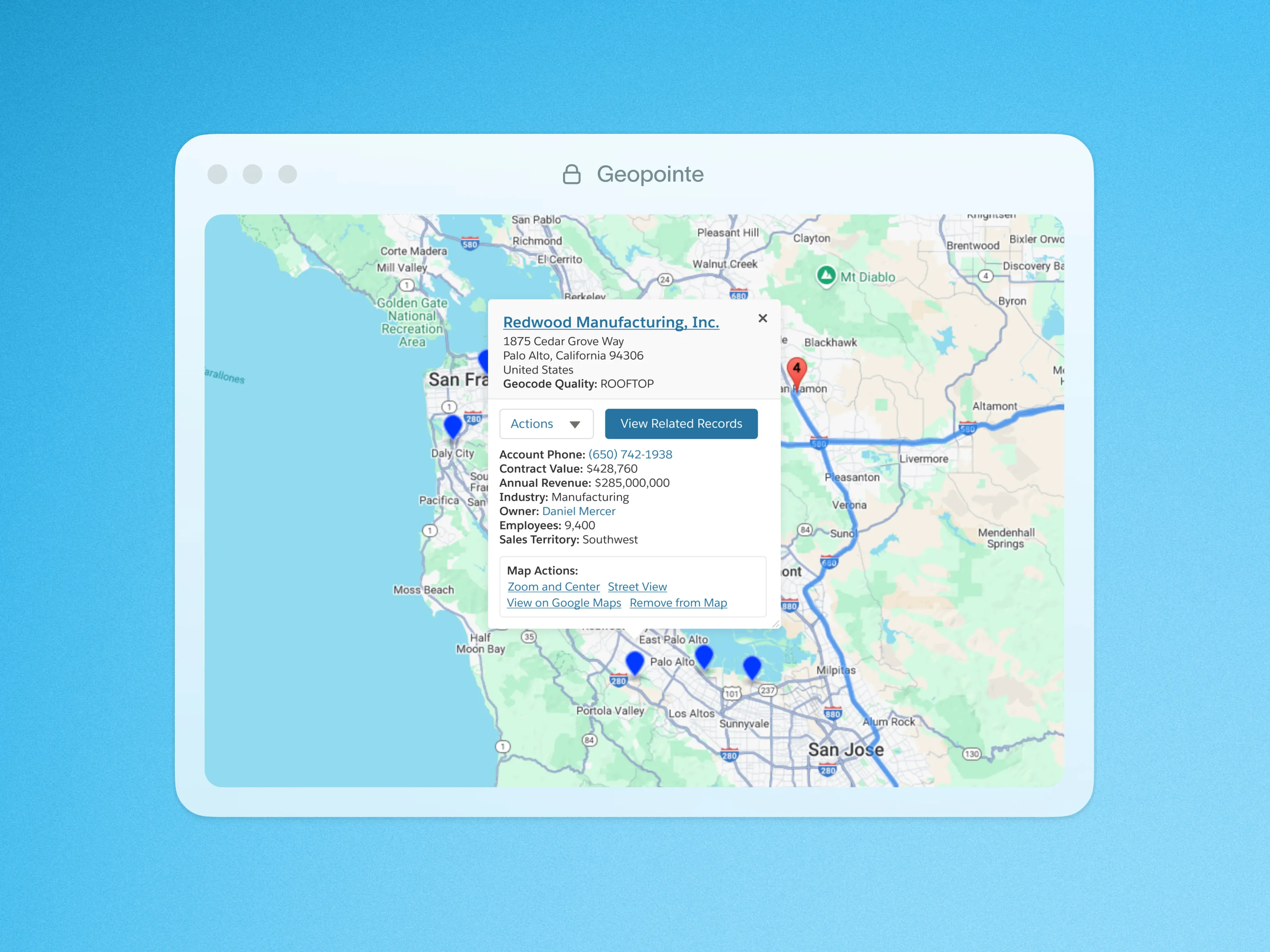 Create Salesforce records directly from the map using location data and nearby context.