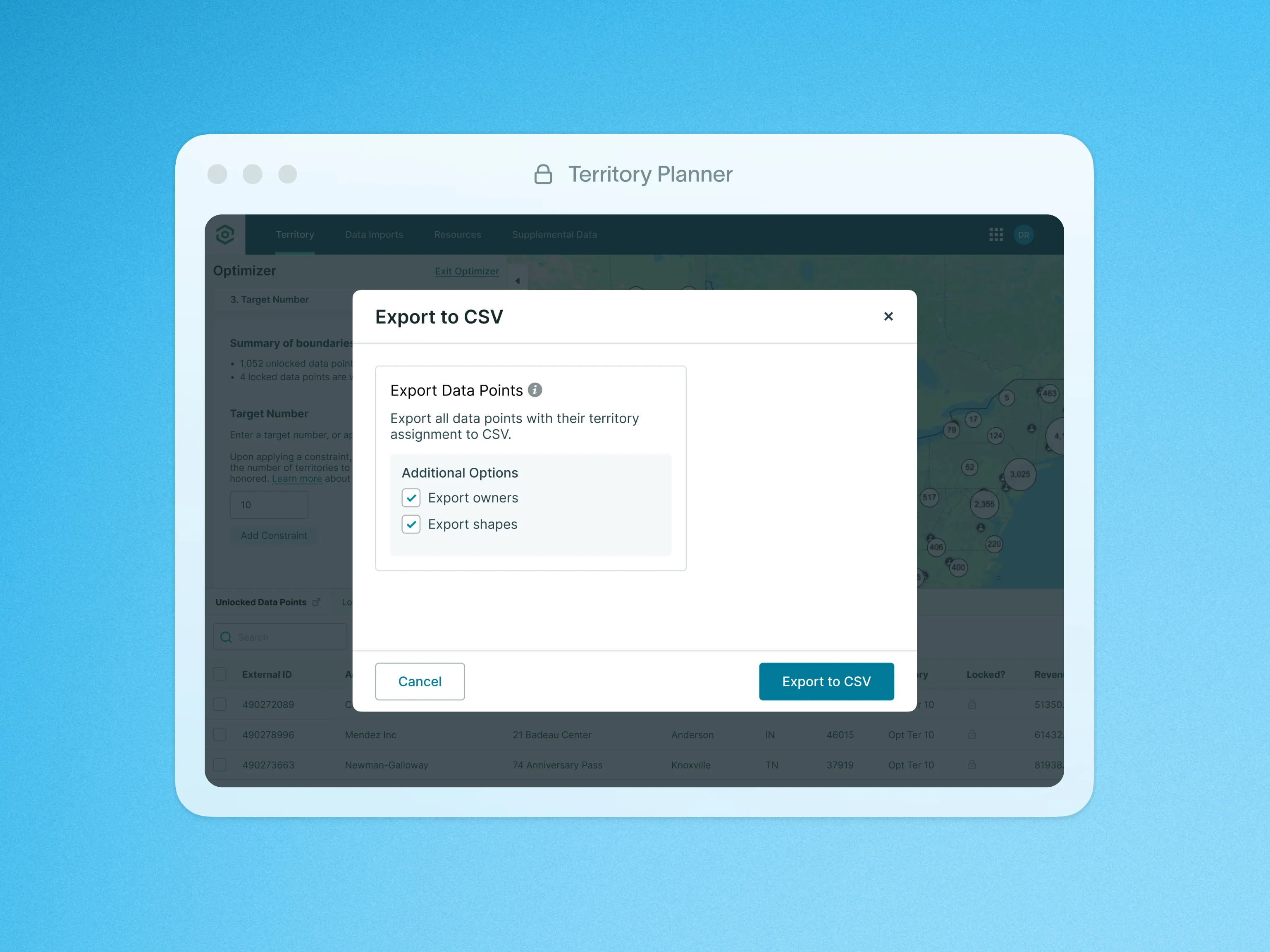 The Export to CSV action generates a CSV file of relevant data from your Territory Model. This includes your Primary Data Points, the fields included in the model, the assigned territories, and the Assignee and Business Owner.