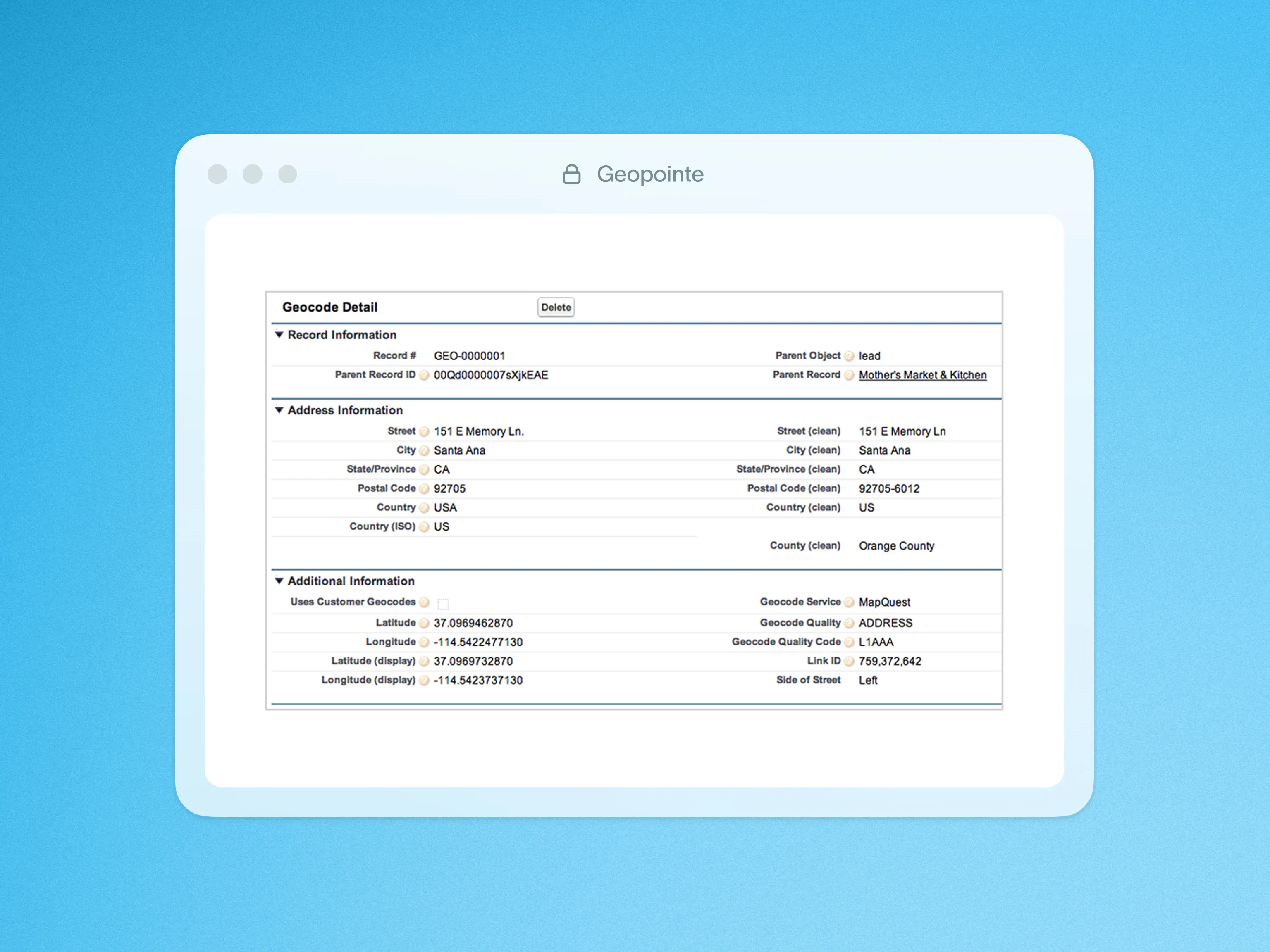 Geopointe continually monitors your data for additions and changes, preparing it for mapping. Geopointe will also return latitude and longitude values. Geopointe also gives you the option to perform on-record and off-record geocoding. On-record will reduce your storage requirements and will not increase your database usage at all. Off-record geocoding generates fewer updates to your records.