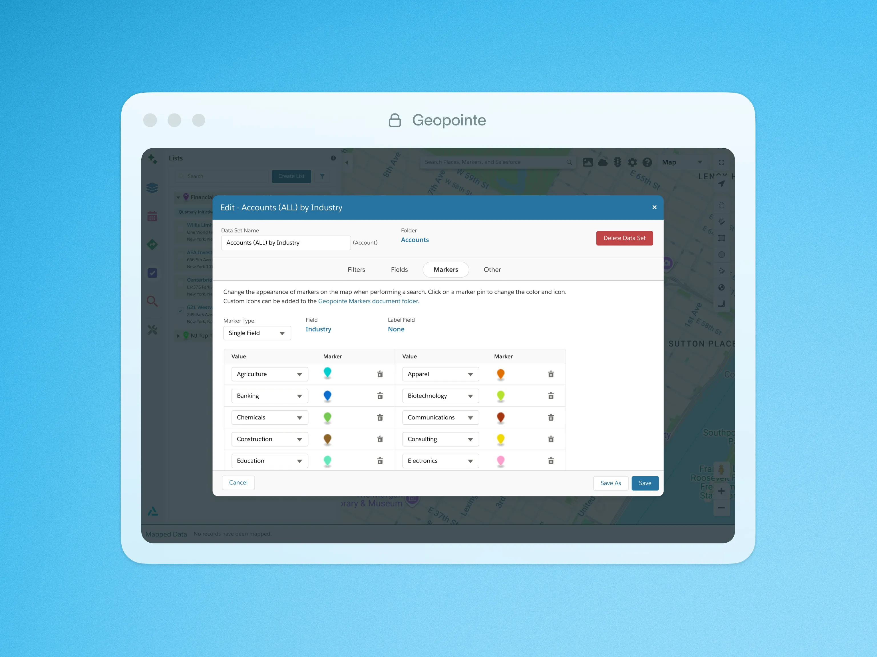 The map markers in Geopointe are customizable. They can be individually configured or be driven off of data fields in Salesforce.