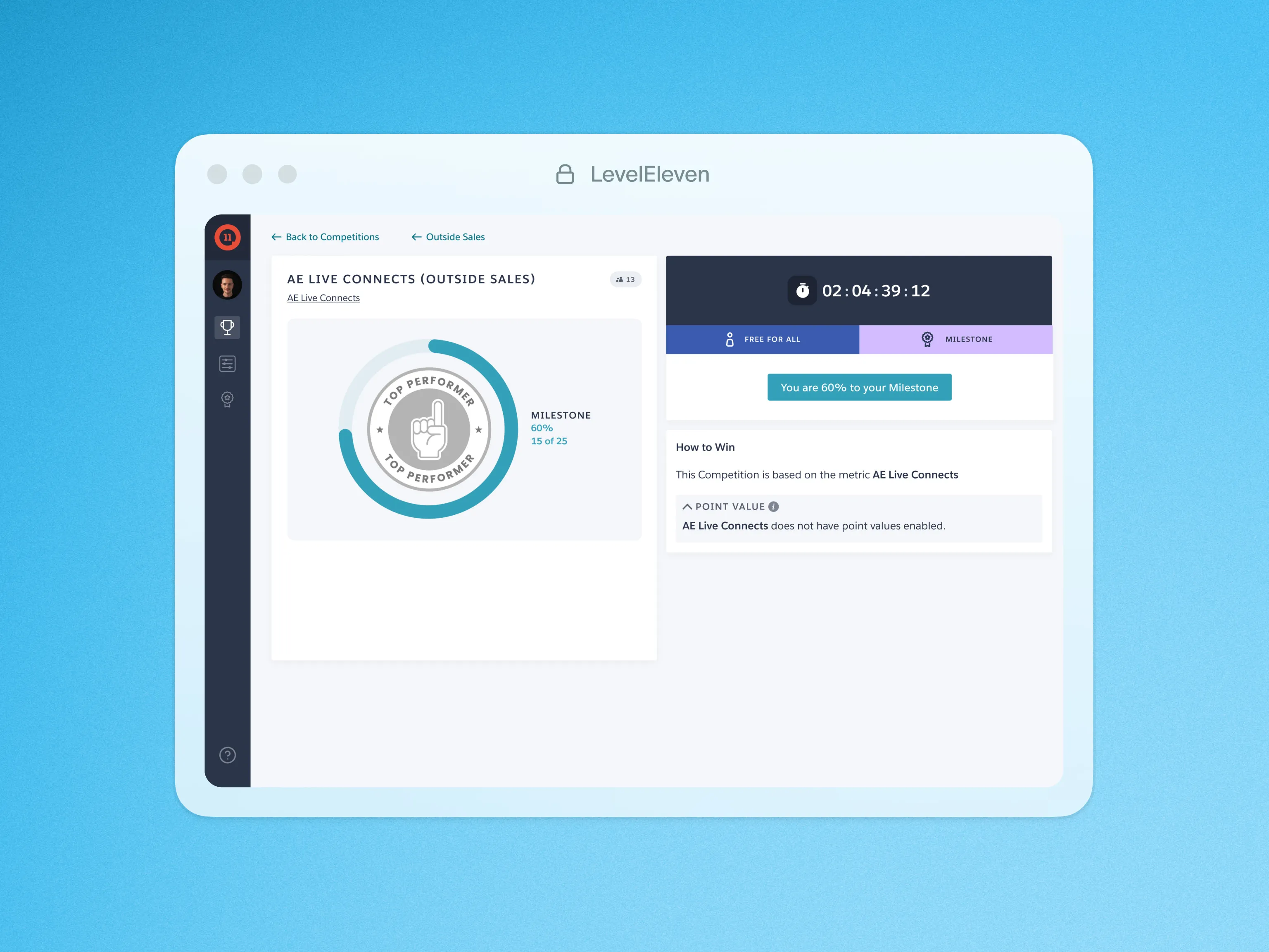 As an impromptu incentive, Milestones allow Managers in LevelEleven to take immediate action when a metric performance is lagging. For example, if a team’s Outbound Calls are falling behind pace mid-month, they can add a Milestone to that metric to push the team to the finish line.