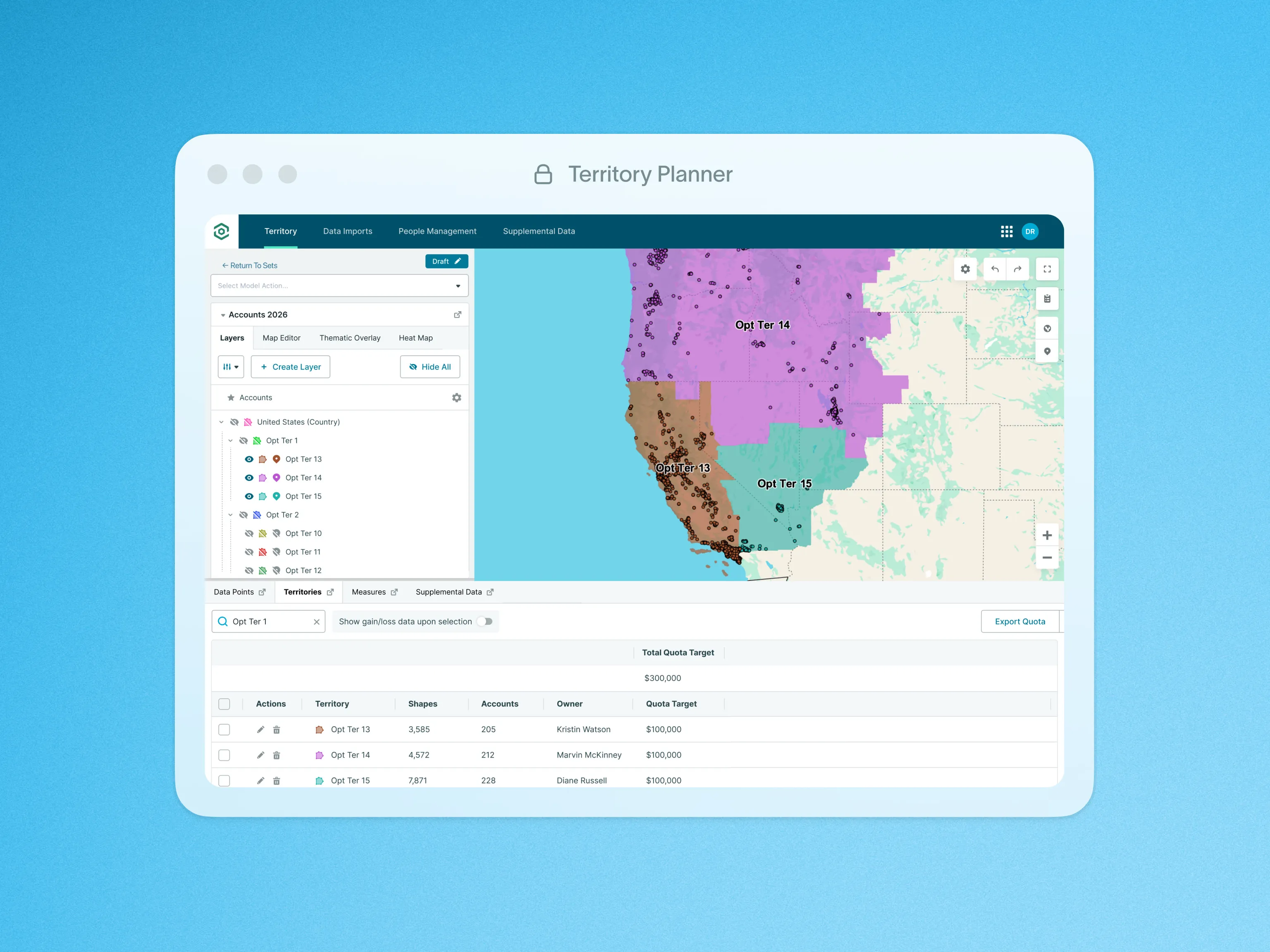 Model changes with real capacity and potential, compare scenarios, then roll out assignments cleanly so territory moves do not create overlap, gaps, or confusion in the field.